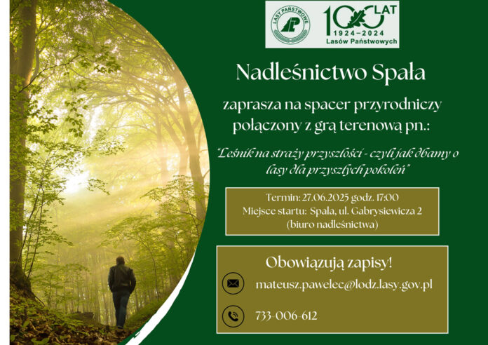 Wydarzenie odbędzie się 27.06.2025 o godzinie 17:00. Miejsce startu przy ul. Gabrysiewicza 2 w Spale. Spacer będzie trwał około 2,5 h, a trasa wiedzie drogami leśnymi nadleśnictwa (pętla). Zapraszamy wszystkich chętnych i tych młodszych i tych starszych