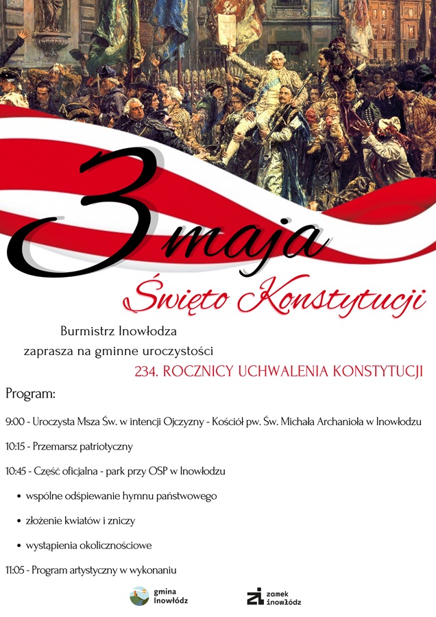 Burmistrz Inowłodza zaprasza na gminne uroczystości 234. rocznicy uchwalenia Konstytucji 3 Maja.