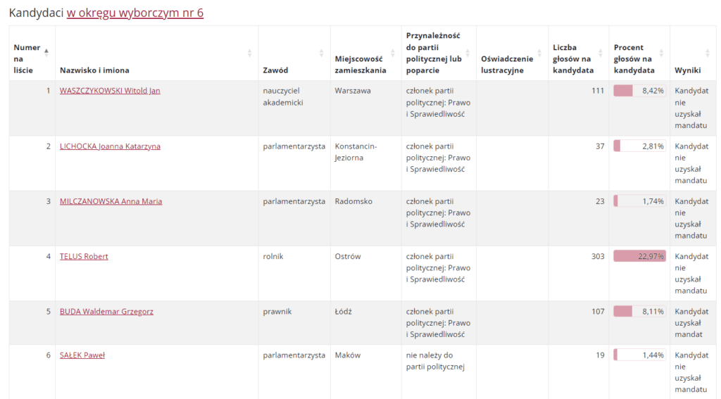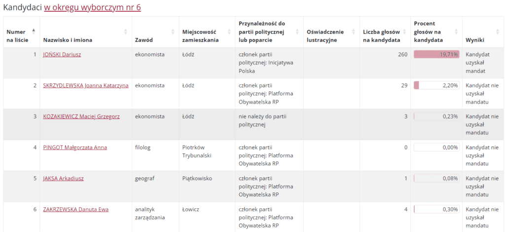Wyniki głosowania na kandydatów zarejestrowanych przez KW PRAWO I SPRAWIEDLIWOŚĆ w gm. Inowłódz