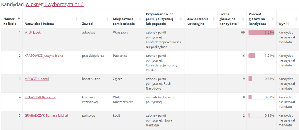 Wyniki głosowania na kandydatów zarejestrowanych przez KW KONFEDERACJA WOLNOŚĆ I NIEPODLEGŁOŚĆ w gm. Inowłódz