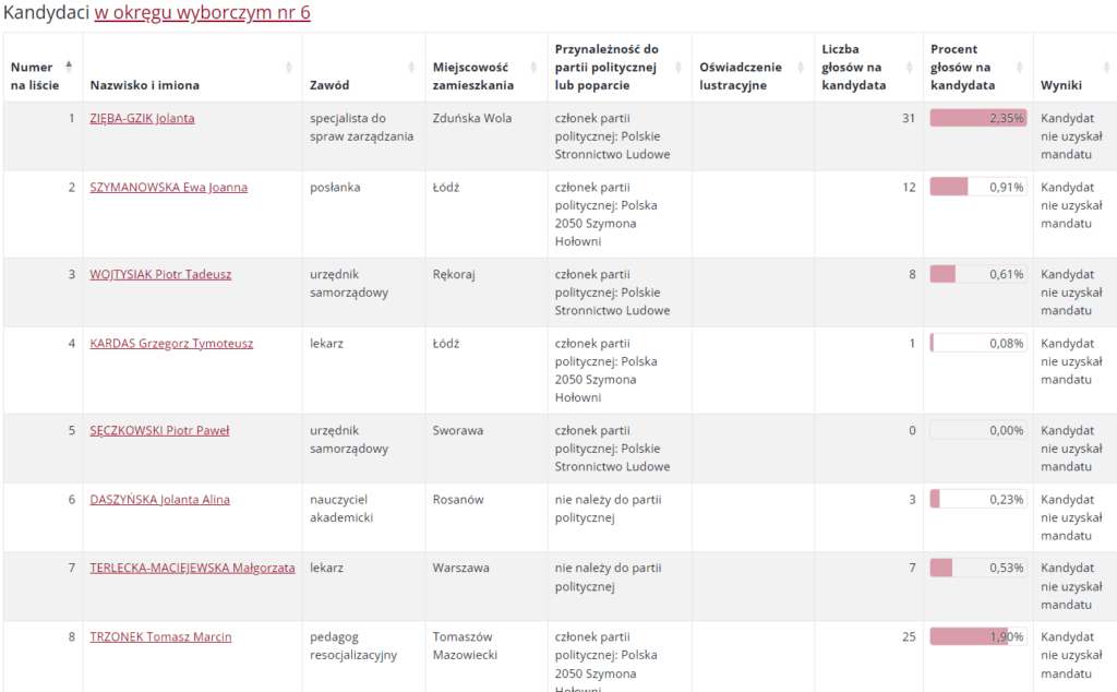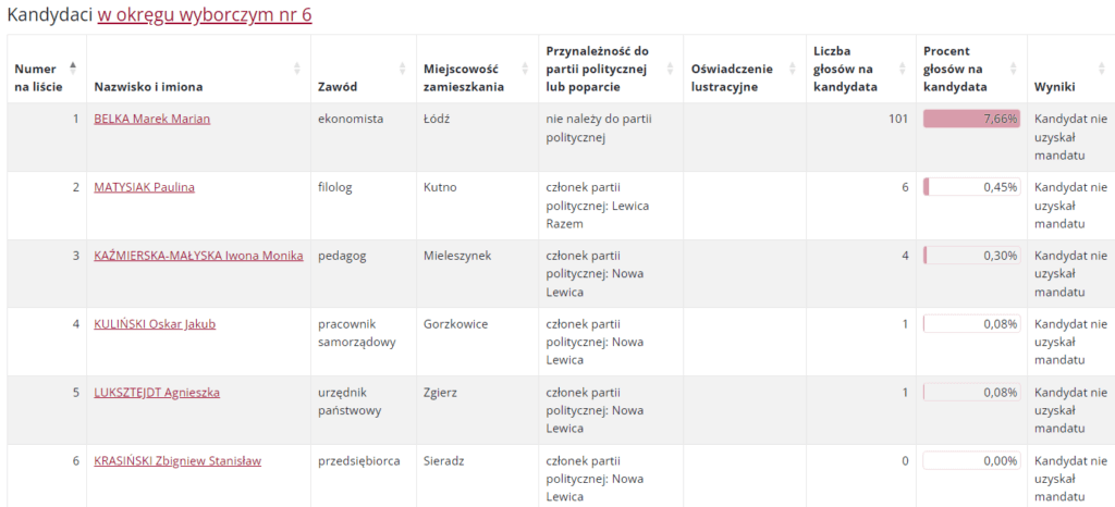 Wyniki głosowania na kandydatów zarejestrowanych przez KKW LEWICA w gm. Inowłódz