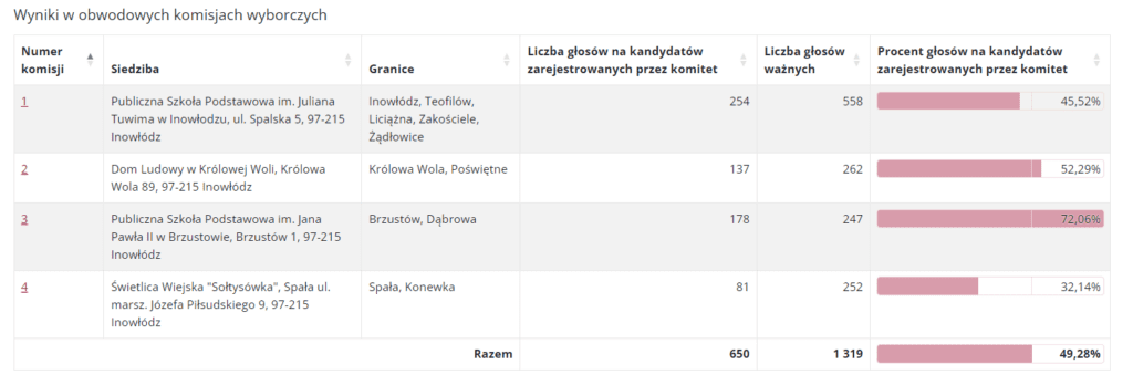 | Procent głosów na kandydatów zarejestrowanych przez komitet w gm. Inowłódz | 49,28% |